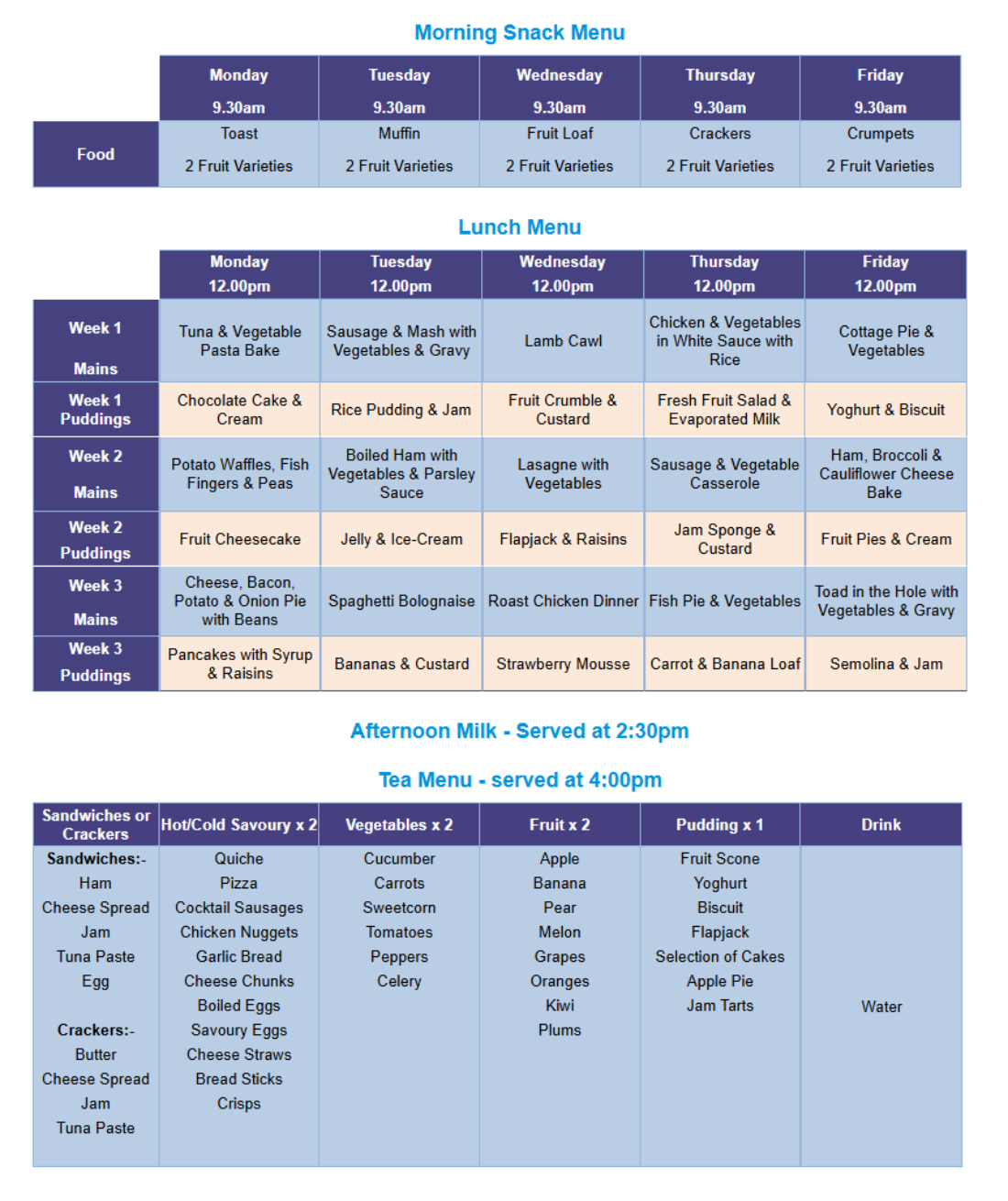 The menu is rotated every three weeks to ensure variety. All snacks and meals are served with milk or water, with special dietary requirements catered for (vegetarians, allergies etc.) For young babies we provide a variety of pureed fruit and vegetables until they are ready to progress onto the next stage where we provide pureed/mashed food selected from the lunch menu.